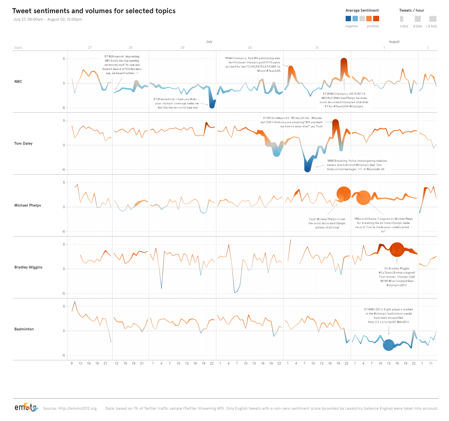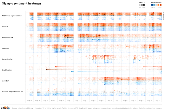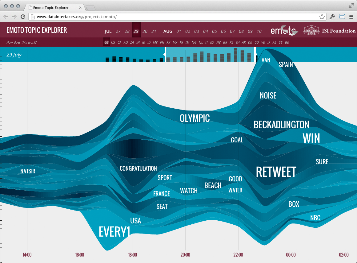 We also supplied the collected data to the Data Science Laboratory of the ISI Foundation. As a result of the collaboraton, the EMOTO Topic Explorer is an exploratory tool designed to expose the topical and temporal dimensions of Twitter conversations. Grouping thousand of tweets into thematic clusters, the interface provides an overview of online discussions and of collective attention flow over time. Try out the online version to see what topics were discussed on Twitter during the Olympics, zoom in on the salient moments, and understand how the contributions and interest differ across the nationalities.