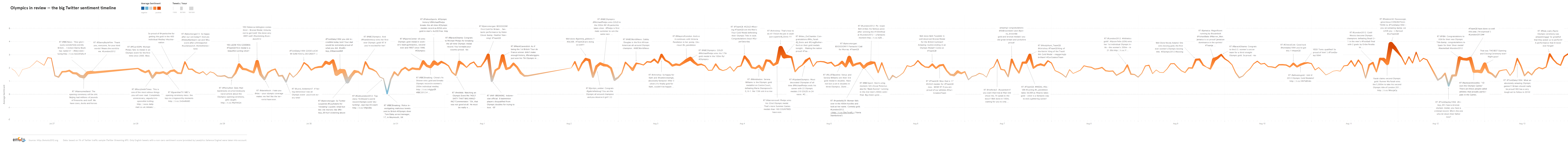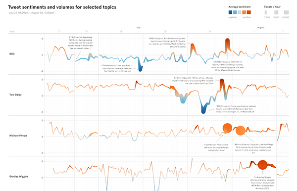 In the online visualisation, we have created two different perspectives onto the data. Using a combination of two interactive views, users were able to explore the ebbs and flows of discussions online. The Topics View, focused on communicating how much positive or negative attention each event, athlete or social topic was generating at each moment and over time. The anecdotal and ephemeral was seen in the Message Stream View which showed Tweets in real-time as they were posted around the world.